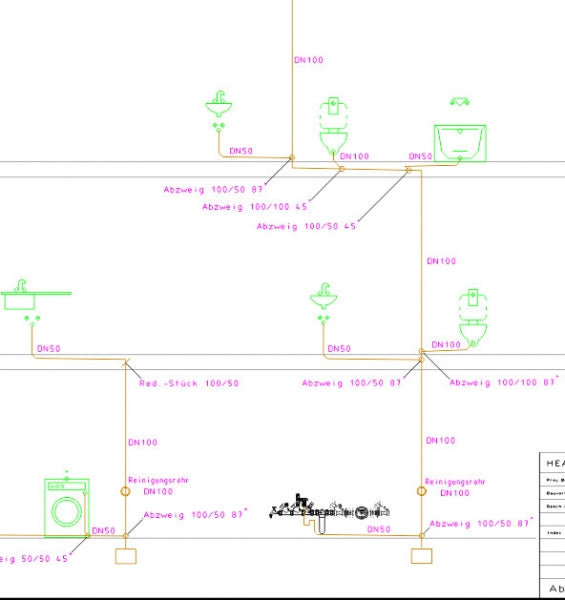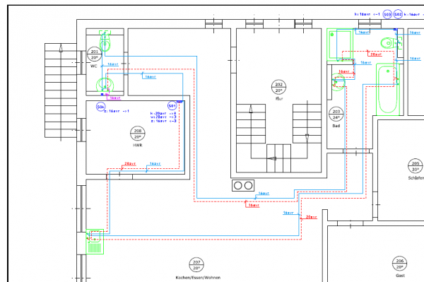 - Grundrisse mit eingezeichneter Trinkwasser und Entwässerungsplanung